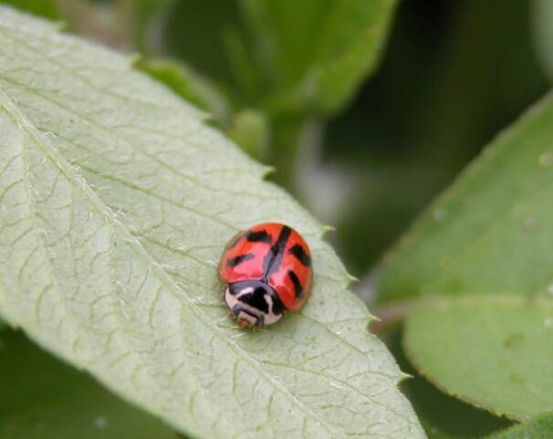 學名:Menochilus sexmaculatus 特徵習性:體長約4.5mm~5.5mm,體表黑色紋路多變,鞘翅中央具不等粗細十字黑紋,前胸背板白色花紋形狀特殊,種內外 觀變異極大;以蚜蟲為主食,平地與低海拔皆常見。 地點:基礎科學大樓後方停車場